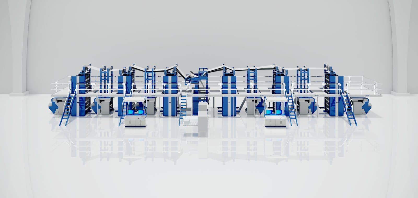 Versatile web offset press capable of up to 4 colours both sides of one web, or 2 colour both sides of two webs.